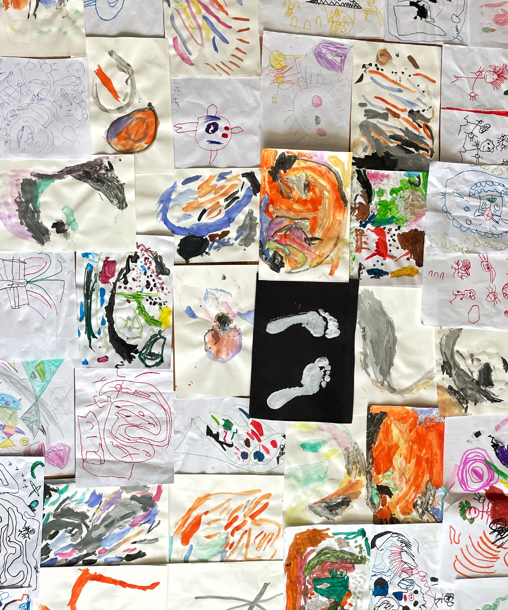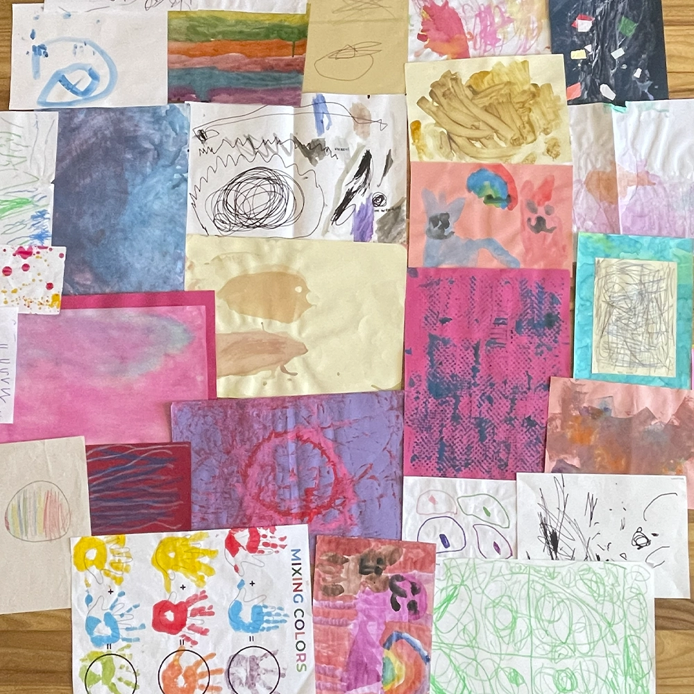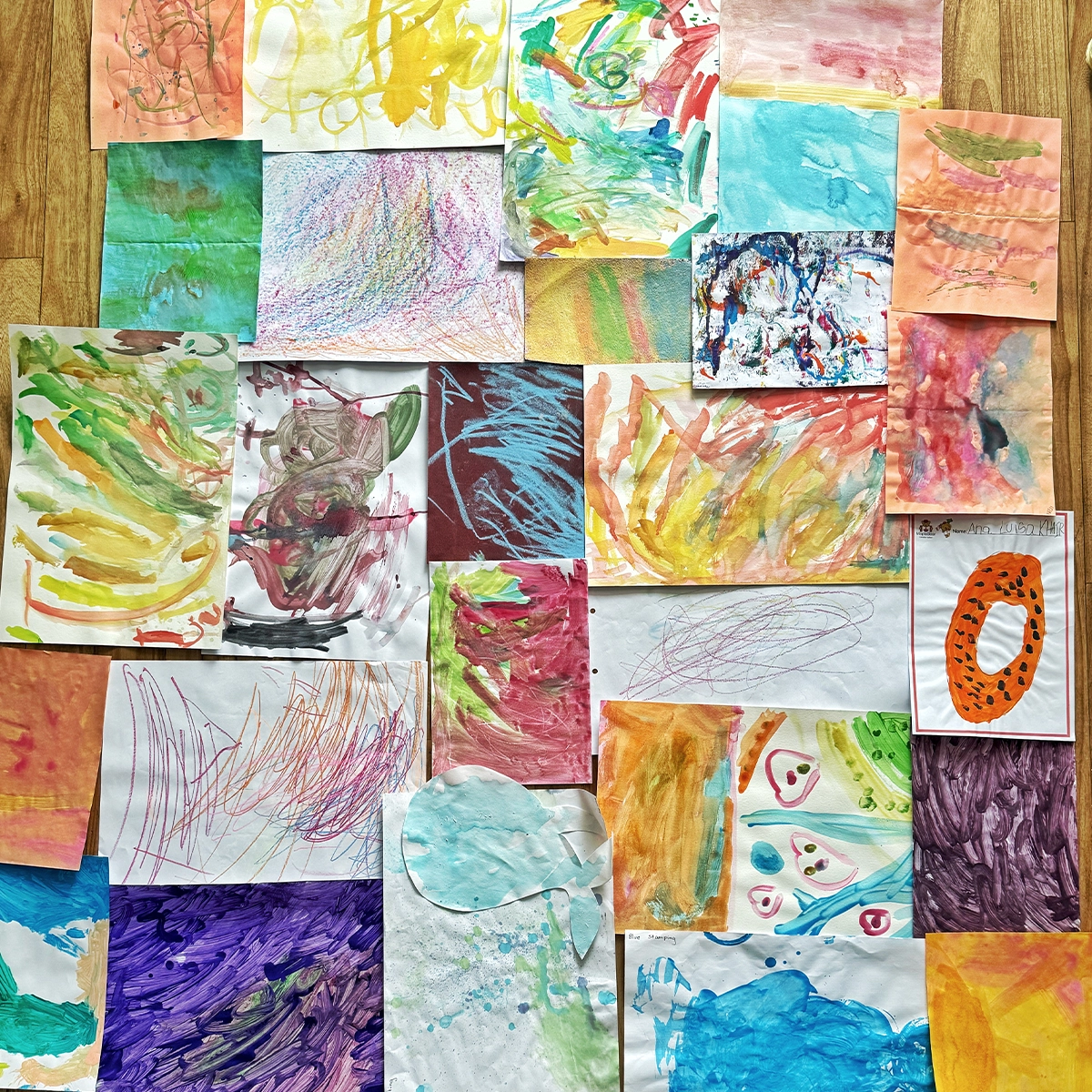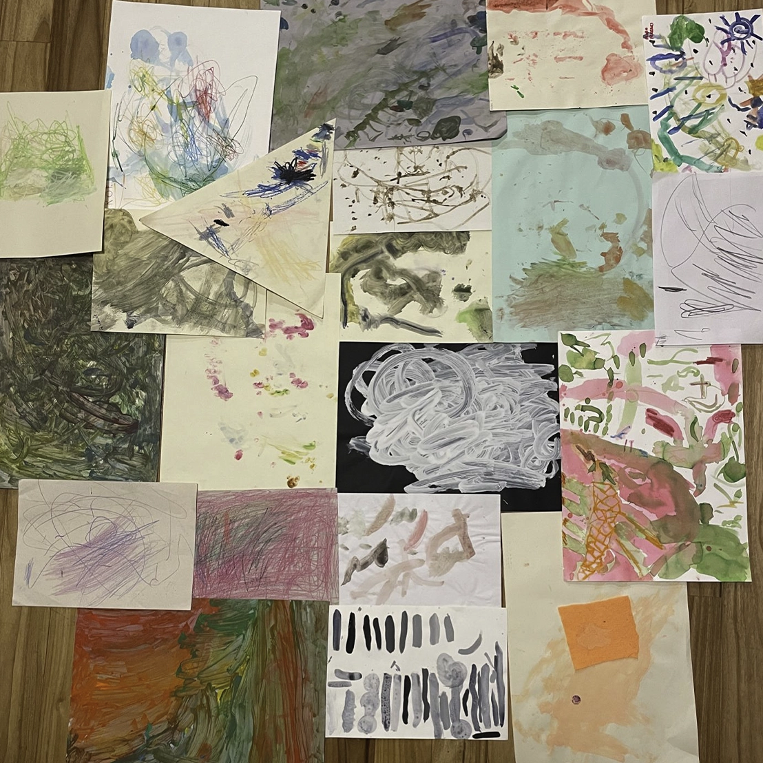 Feitas com artes e desenhos abstratos do início da infância até mais ou menos 4 anos (garatujos, rabiscos, carimbos de pés e mãos).