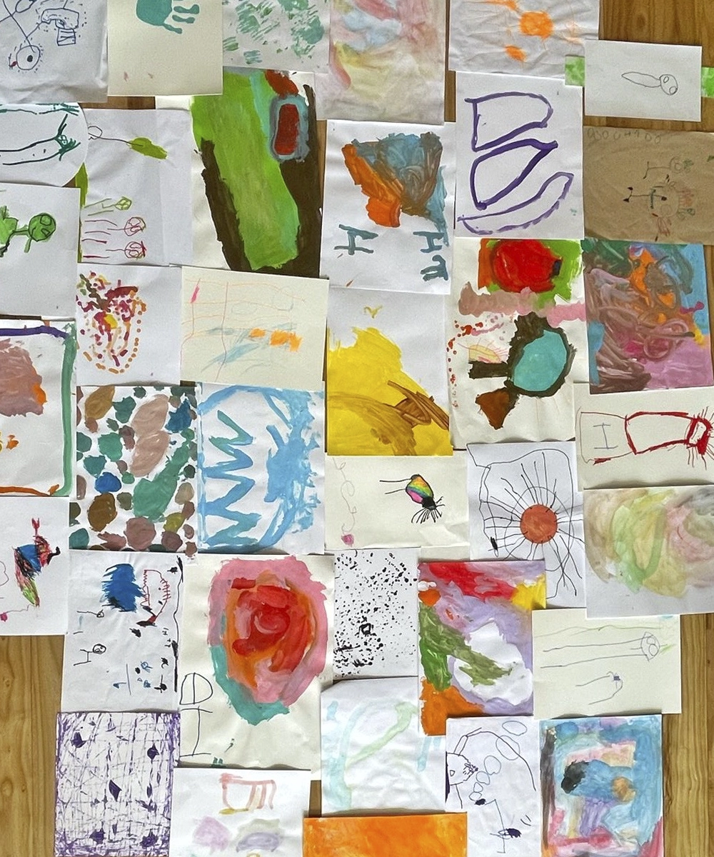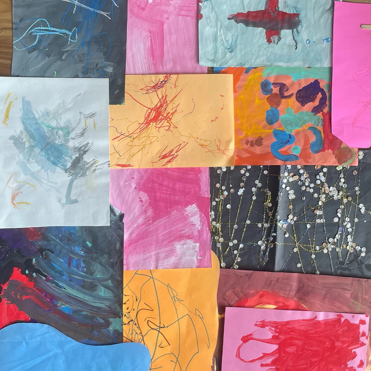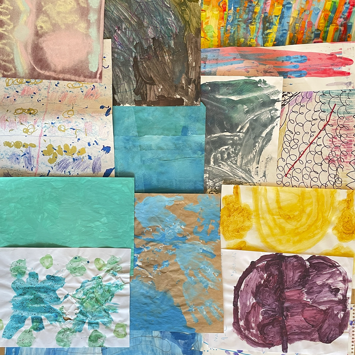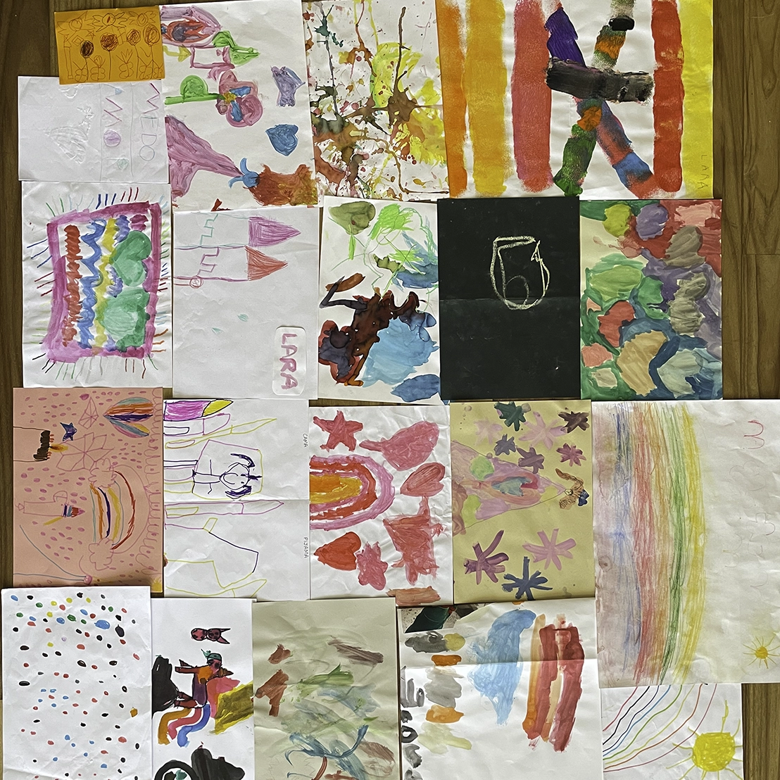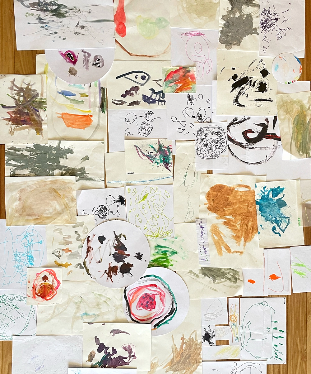 Feitas com artes e desenhos abstratos do início da infância até mais ou menos 4 anos (garatujos, rabiscos, carimbos de pés e mãos).