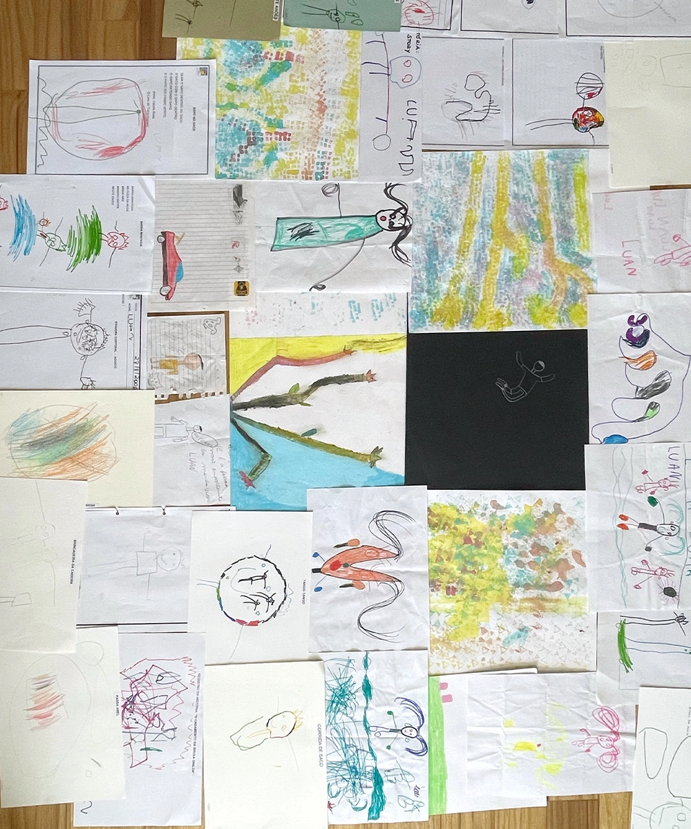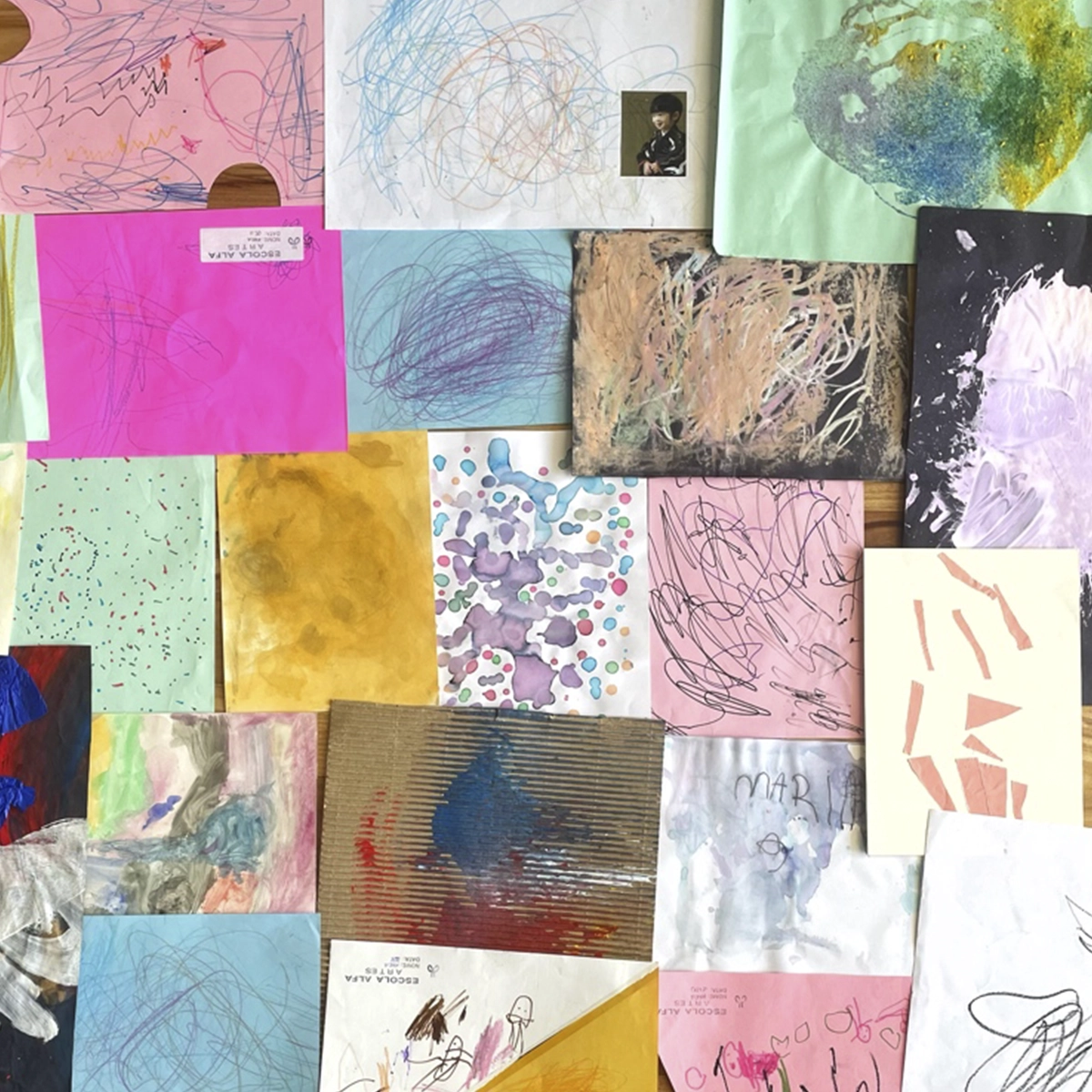 Os desenhos originais recebem intervenção artística de técnica mista (recorte, colagem e repintura). Todos os desenhos escolhidos para entrar na obra são repintados com mais de 3 camadas de tinta, sempre priorizando as cores que a criança já escolheu. Quando ela não colori, eu como artista pinto. Todos os desenhos que sobram são devolvidos junto com a obra.